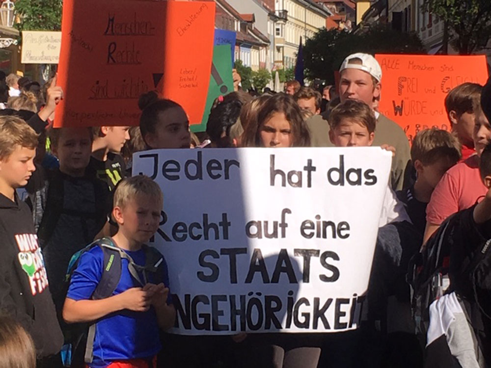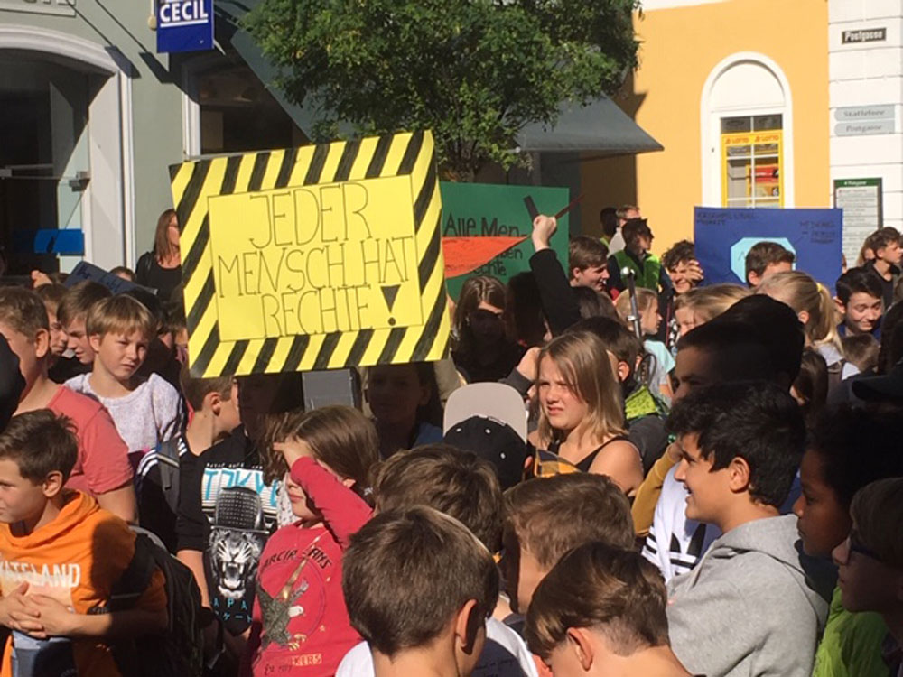 Höhepunkt der Kunstaktion war eine Schülerdemonstration für Menschenrechte, an der 600 Kinder und viele Erwachsene, darunter auch der Murnauer Bürgermeister Rolf Beuting teilnahmen. Weitere Informationen finden sich im Bericht des Murnauer Tagblatts.